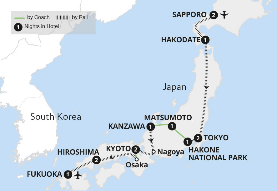 Explore Japan from top to toe on an epic overland expedition from Hokkaido in the north to Kyushu in the south. Experience all Japan has to offer, while journeying on ultramodern bullet trains. Compare Sapporo's scenic setting to Tokyo's neon-lit streets, and discover this captivating country's history through its tranquil temples, delicate...
