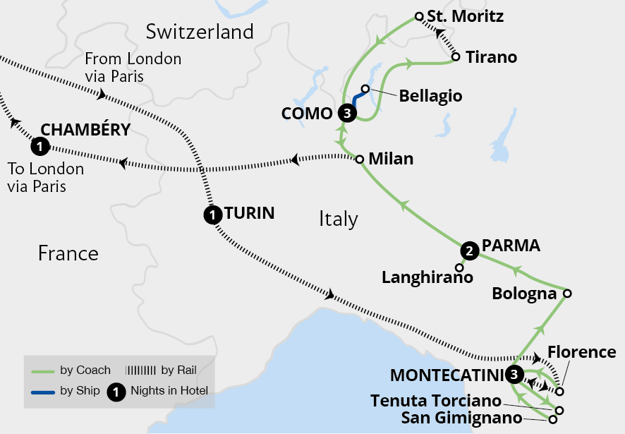 Travel through Tuscany to Florence and San Gimignano, where we witness centuries of art and architecture and learn about pizza and wine at a 300-year-old estate. Continuing to Emilia-Romagna, experience the culinary traditions of Bologna and taste Parma ham. Rounding off this journey, a relaxing stay at Lake Como and a sensational First Class rail journey to St Moritz on the Bernina Express leave you captivated by Italy.