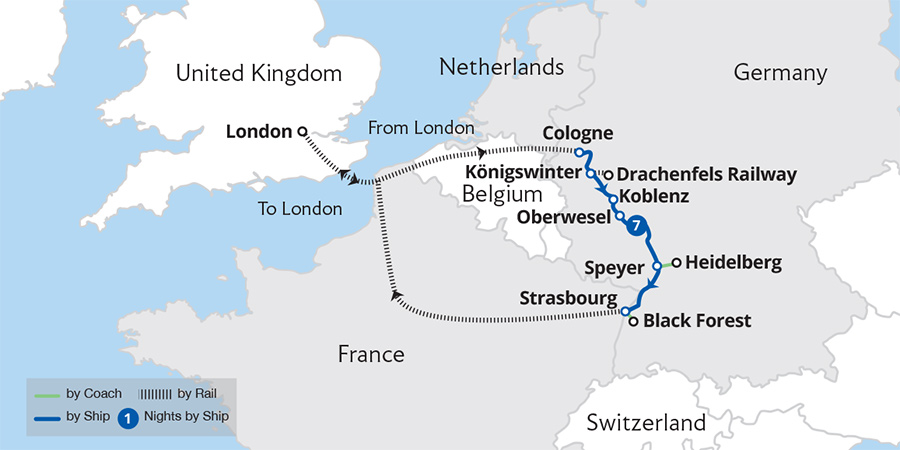 This beautifully scenic, easy-paced cruise takes us to the towns and cities of the River Rhine. Sailing by enchanting landscapes, discover Heidelberg and Strasbourg along with the sensational vistas of the UNESCO-listed Rhine Gorge. From Cologne, we sail south to explore the town of Koblenz, enjoy a guided tour of Heidelberg, and wander...